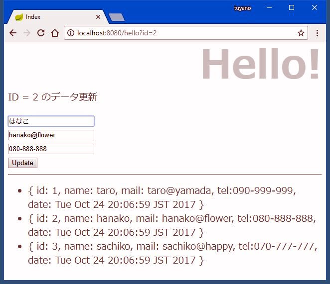 これで、以下のようにアドレス指定してアクセスすると、指定のIDのデータがフォームに設定されます。