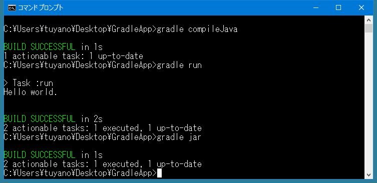 プログラムのコンパイル、実行、Jar作成といった作業を行なっています。実行時には「Hello World.」とメッセージが出力されます。また「build」フォルダ内の「libs」フォルダには、「GradleApp.jar」というJarファイルが作成されるのがわかるでしょう。