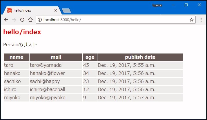 ここでは、<table>タグを使って、取得したレコードをテーブルに整形し表示しています。モデルクラスの内容を出力している部分を見てみるとこうなているのがわかりますね。