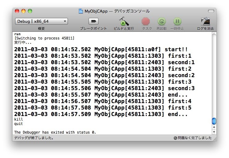 [NSThread detachNewThreadSelector:@selector(printMessage:)セレクタには、@selector(printMessage:)というようにしてprintMessage:を指定しています。ターゲットはMyTestClassインスタンスが収められた変数。そしてメソッドの引数にNSStringを用意しています。これで、後は放っておくだけ。勝手に処理を実行していってくれるのです。
