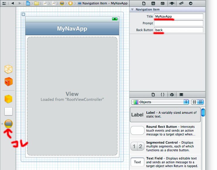 Title:MyNavAppTitleは、タイトルとして表示するテキストです。またBack Buttonは、戻るボタンに表示するテキストです。このBack Buttonにテキストを設定すると、移動時に自動的に戻るボタンが現れるようになります。――さあ、これで新しいビューと、ナビゲーションアイテムの設定は終わりました。