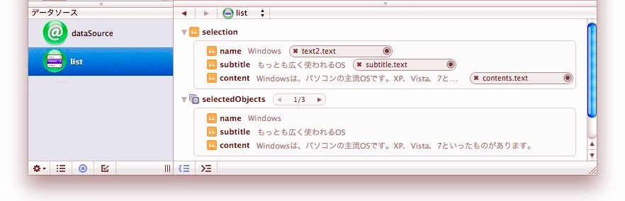 このlistには、「selection」と「selectedObjects」という項目が用意されます。selectionとは、選択された項目のことで、ここに各データの中身(ここでは、name、subtitle、contentといった項目)が表示されます。selectedObjectsには、実際に用意されてるデータ配列がまとめられており、その場でデータの内容を表示します。