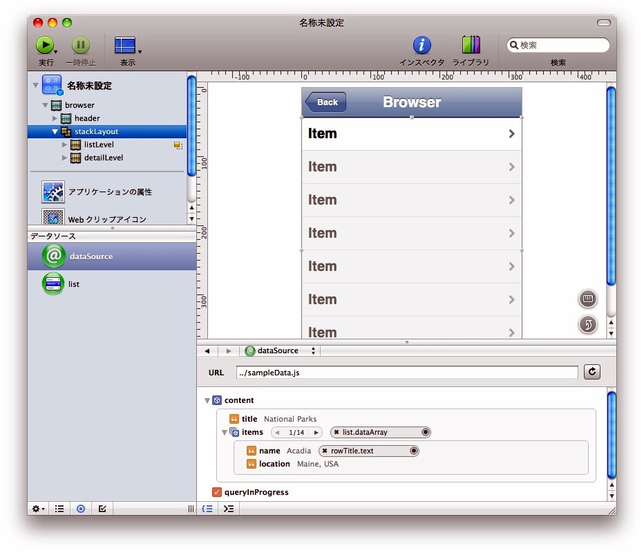 内部にリストが1つ用意されています(id = "list")。このリストのdataArrayプロパティに、データソースのitemsが接続されています。また、nameがリストのラベルに相当するrowTitleのtext属性に接続されています。