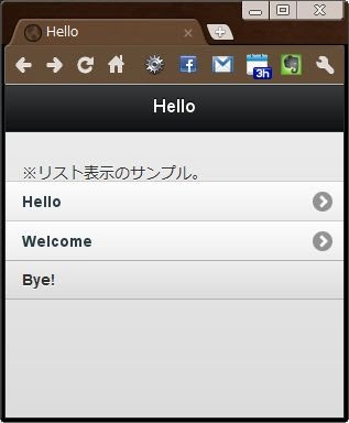 <!DOCTYPE html PUBLIC "-//W3C//DTD XHTML 1.0 Transitional//EN" "http://www.w3.org/TR/xhtml1/DTD/xhtml1-transitional.dtd"> <html xmlns="http://www.w3.org/1999/xhtml" xml:lang="ja"> <head> <meta http-equiv="content-type" content="text/html;charset=utf-8" /> <title>Sample</title> <link rel="stylesheet" href="http://code.jquery.com/mobile/1.0.1/jquery.mobile-1.0.1.min.css" /> <script type="text/javascript" src="http://code.jquery.com/jquery-1.6.4.min.js"></script> <script type="text/javascript" src="http://code.jquery.com/mobile/1.0.1/jquery.mobile-1.0.1.min.js"></script> </head> <body> <!-- home page --> <div id="home" data-role="page"> <div data-role="header"> <h1>Hello</h1> </div> <div data-role="content"> <p>※リスト表示のサンプル。</p> <ul data-role="listview"> <li><a href="#other" data-transition="slide">Hello</a></li> <li><a href="#other">Welcome</a></li> <li>Bye!</li> </ul> </div> </div> <!-- other page --> <div id="other" data-role="page"> <div data-role="header"> <h1>Next</h1> </div> <div data-role="content"> <p>次のページですよ。</p> </div> </div> </body> </html>