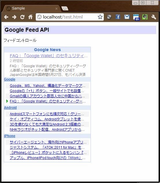 ここで利用しているのは、「ダイナミックフィードコントロール」と呼ばれるものです。これは、Feed APIには含まれていません。スクリプトとスタイルシートを別途読み込むようにしなければいけません。