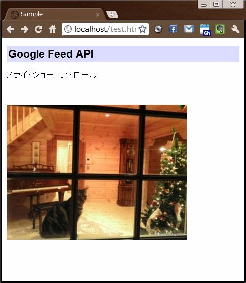 };後は、オブジェクトを作成するだけです。スライドショーは「GFslideShow」という名前のオブジェクトとして用意されています。これをnewします。引数には、表示するフィードのアドレス、スライドショーを表示するタグのID、そして設定情報の連想配列を用意します。var ss = new GFslideShow(feed, "container", options);}