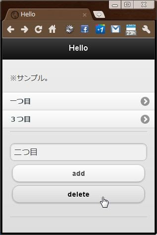 $(コンポーネント指定).listview('refresh');これでコンポーネントの表示が更新され、追加/削除が反映されます。――では、下に実際の利用例を挙げておきましょう。入力フィールドにテキストを書いて「Add」ボタンをおすと、そのテキストが新たな項目として追加されます。また「Delete」ボタンをおすと、入力フィールドに書いた名前の項目が削除されます。ここでは、単に<li>タグを作って<ul>に組み込むのでなく、<li>の中に更に<a>タグを組み込むようにしてあります。実際のリストでは、このように<a>タグを使って他のページなどに移動するようにしておくのが一般的ですから、まず<a>タグを作成し、これを<li>タグに組み込み、この<li>タグを更に<ul>タグに組み込む、という手順になるでしょう。それが以下の部分です。