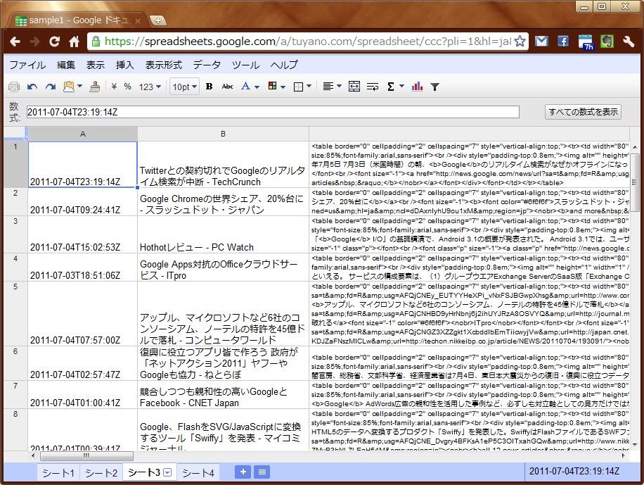 では、実際の利用例として、Googleニュースから「Google」の記事のRSSデータを取得し、アクティブシートにアップデート日、タイトル、コンテンツを書き出す、といったことをやってみましょう(下リスト)。