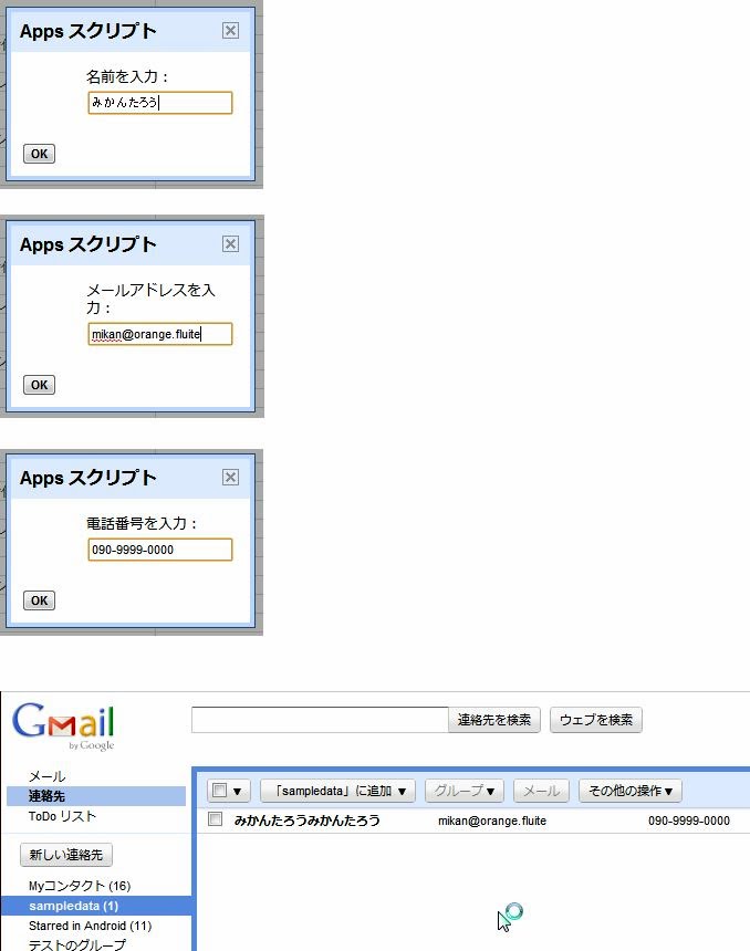 では、下のリスト欄に、簡単なサンプルを挙げておきましょう。入力ダイアログを使い、名前・メールアドレス・電話番号を入力すると、新しい連作先を作成し、「sampledata」というグループに登録します。