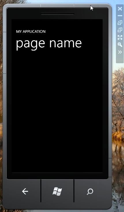画面に、Windows Phoneの表示が現れ、その中で「MY APPLICATION page name」といったテキストが表示されます。これが、作成したアプリの実行画面です。まぁ、何の機能もないものですが、とりあえずこれで「アプリをエミュレータで動かす」というやり方はわかりました。