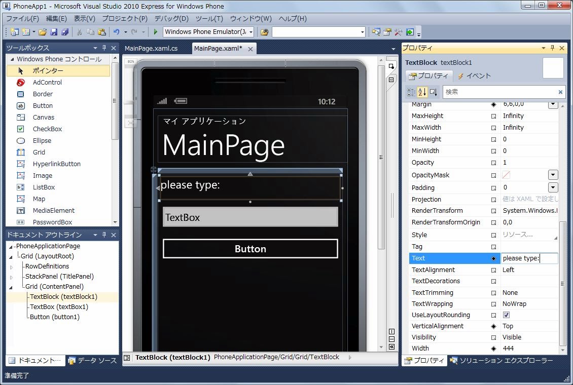表示されるテキストは、「Text」プロパティとして設定されています。これを「please type:」と変更しておきます。また、既にある「マイアプリケーション」や「ページ名」なども適当に変更しておいてかまいません。