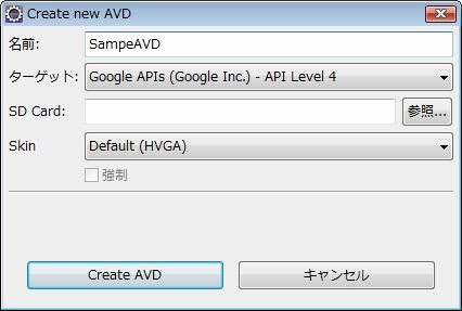 必要な項目を記述してOKすると、「SampleAVD」というバーチャルデバイスが作成されます。
