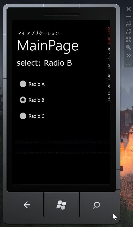 ここでは、引数に渡されたobjetをRadioButtonにキャストし、そのContentプロパティーを取り出して表示しています。注意すべきは、「ここでNullReferenceExceptionが発生する可能性がある」という点です。引数のobjectをキャストして利用する場合、常に「オブジェクトが空っぽだったら」という例外処理を考える必要があるようです。(そうしないとVisual Studioに怒られます)