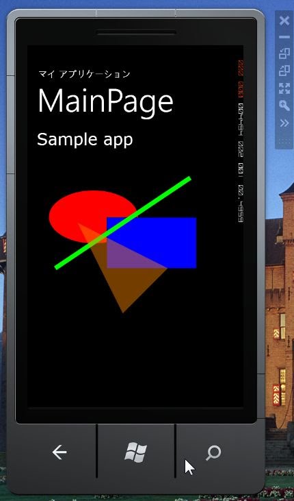 <!--ContentPanel - 追加コンテンツをここに入力します--> <Grid x:Name="ContentPanel" Margin="12,0,0,12" ShowGridLines="True" Grid.RowSpan="2" Grid.Row="1"> <Ellipse Height="119" HorizontalAlignment="Left" Margin="35,127,0,0" Name="ellipse1" Stroke="Black" StrokeThickness="1" VerticalAlignment="Top" Width="200" Fill="Red" /> <Rectangle Height="114" HorizontalAlignment="Left" Margin="164,187,0,0" Name="rectangle1" Stroke="Black" StrokeThickness="1" VerticalAlignment="Top" Width="200" Fill="Blue" /> <Line X1="50" Y1="300" X2="350" Y2="100" Fill="Lime" Stroke="Lime" StrokeThickness="10" /> <Polygon StrokeThickness="5" Fill="#70FF8700"> <Polygon.Points> <Point X="200" Y="400" /> <Point X="300" Y="300" /> <Point X="100" Y="200" /> </Polygon.Points> </Polygon> </Grid>
