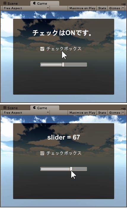 ここまでできたら、シーンを保存して実行してみましょう。そしてチェックボックス(Toggle)やスライダーを操作してみてください。操作して値が変更されるとその場でテキストの表示が変わります。