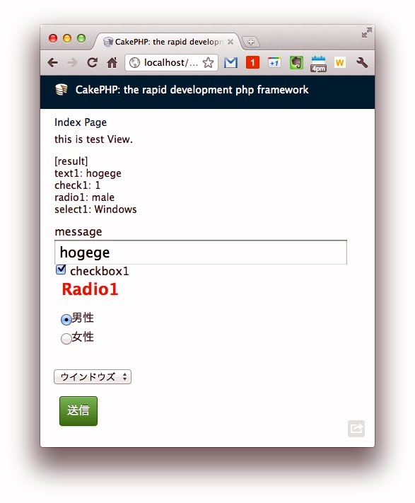 $this->Form->radio( 名前 , 配列 , 連想配列 );ラジオボタンはradioメソッドで生成しますが、これは引数が少し違っています。第1引数は名前を指定しますが、第2引数には、作成するラジオボタン名を配列にまとめたものを指定します。これは、ただ名前を配列にしたものでもいいのですが、valueをキーとし表示テキストを値とする連想配列の形でまとめたものでも受け付けることができます。第3引数は、例によって属性の連想配列です。