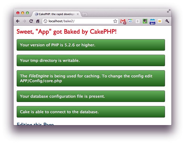 これらの設定を行って保存したら、Webアプリケーションのルートにアクセスしてみましょう(cake2というフォルダでCakePHPが用意されているなら、http://localhost/cake2/)。CakePHPの状況が表示されます。ここで一番下の項目に「Cake is able to connect to the database.」と緑色で表示されていますか? これが現れていれば、無事、CakePHPからデータベースに接続できています。