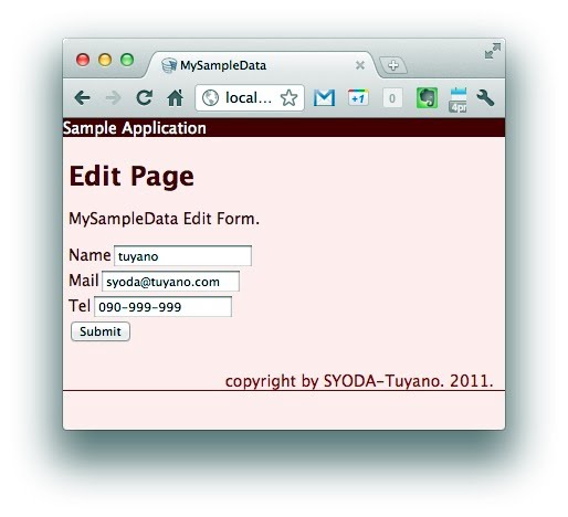 http://〇〇/edit/番号という形で記述してアクセスをします。例えば、ID = 1のデータを編集したければ、〇〇/edit/1としてアクセスすると、ID = 1のデータがフォームに設定された状態で画面現れます。ここで内容を編集し、送信すれば、データが更新されます。