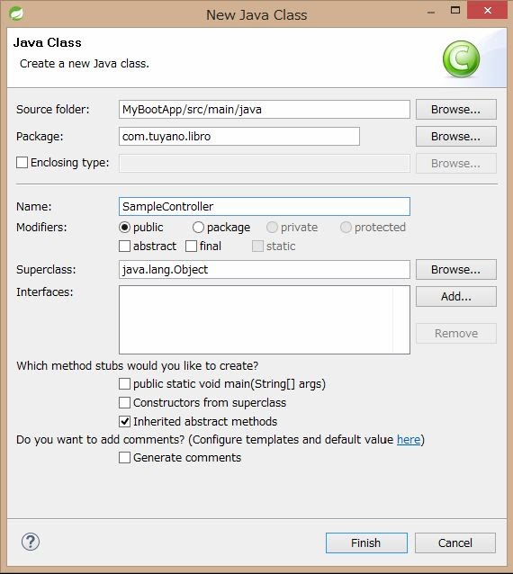 メニューを選ぶと、クラス作成のためのダイアログが現れます。既にEclipseを使ったことがあれば、改めて説明するまでもありませんね。ここでパッケージ、クラス名などを設定してクラスを生成します。例として、「SampleController」クラスを作成してみます。