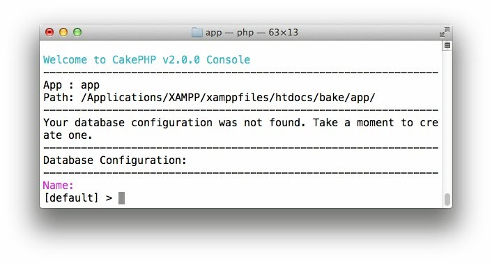 その下に最初に表示されるのは「Database Configuration:」という表示です。bakeを実行するとまずデータベース設定をチェックし、まだ設定がされていない場合は自動的にこの設定作成コマンドが呼び出されるようになっています。最初は、以下のような項目が表示されます。
