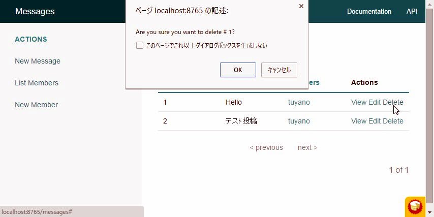 $message = $this->Messages->get($id);まず、Messagesの「get」を使って指定したIDのMessagesインスタンスを取得し、「delete」メソッドを使ってこれを削除する、というものですね。これで削除の処理が完成しました。