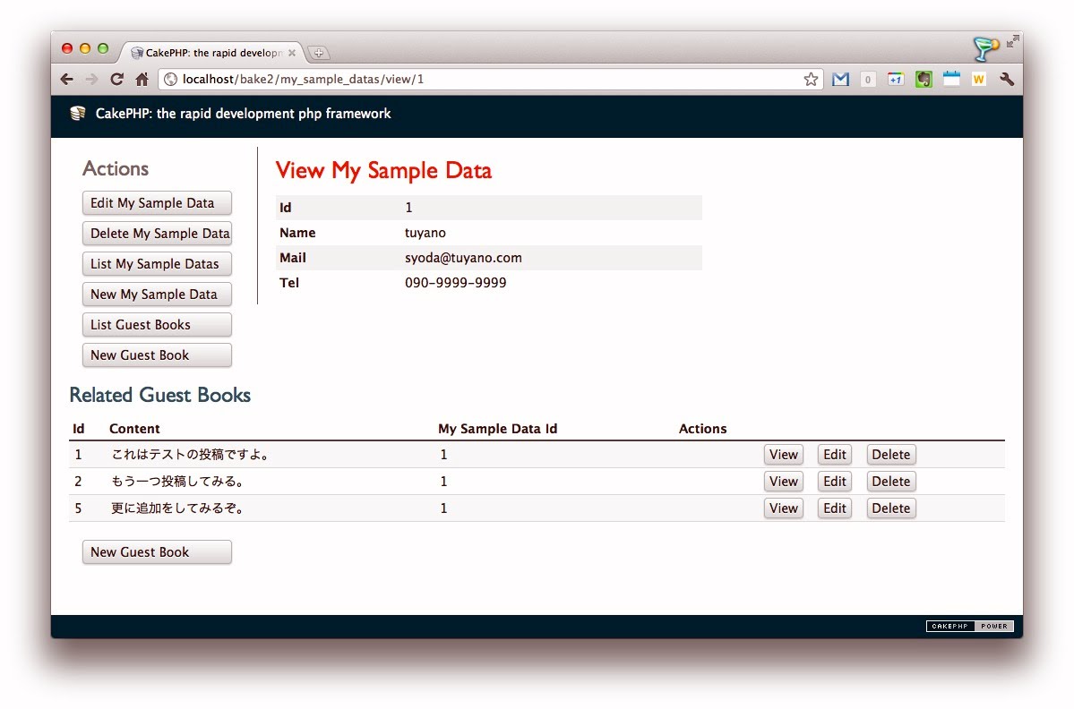 public $hasMany = "関連するModel名";という形で変数を用意することで設定します。先ほどと同じようにMySampleDataの項目の「View」ボタンを押して内容を表示してみてください。関連するGuestBookが複数あった場合、それらがすべて表示されます。