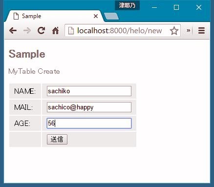 下にサンプルコードを掲載しておきました。こんな形でメソッドをHeloControllerクラスに追加して下さい。そして、http://localhost:8000/helo/new にアクセスしてフォームを送信してみましょう。新しいレコードが追加されます。