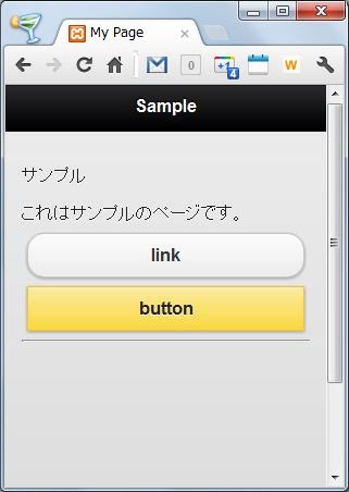 では、プッシュボタンの初期設定を操作してみましょう。下のリスト欄に、その例を挙げておきました。ページにアクセスすると、プッシュボタンが、角の丸みのない黄色いテーマで表示されます。今度は、<a>タグによるボタンはデフォルトのまま変化しません。<input type="button">のプッシュボタンだけが変化していることがわかります。