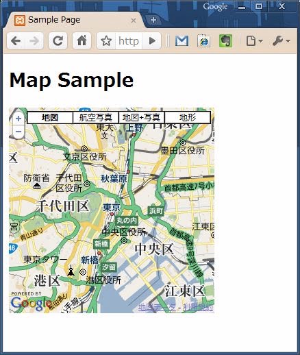 とりあえず、実際に表示するサンプルを見てもらいましょう。下のリストは、東京駅を中心としたマップを表示する例です。Google Maps APIを利用するためには、まず<script>タグのsrcに、Googleサイトにあるライブラリのアドレスを指定してロードしてやる必要があります。このsrcは、