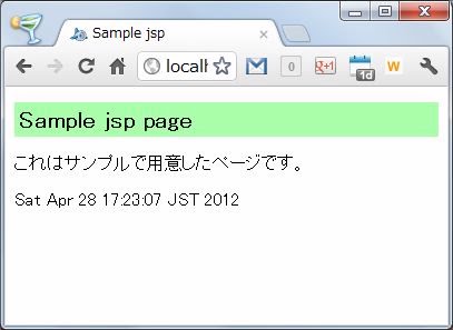 内蔵サーバーが起動したら、「http://localhost:8888/helo.jsp」というアドレスにアクセスしてみましょう。作成したhelo.jspが表示されます。<%= %>で既述しておいた、現在の時刻の値が表示されましたか? これはサーバー側で、<%= java.util.Calendar.getInstance().getTime() %>の文が実行され、その実行結果(日時のテキスト)が表示されていたのです。