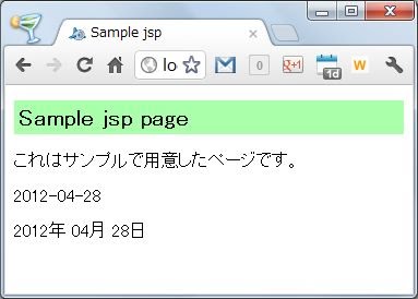 <% printToday(); %>setFormatStrでフォーマットを設定し、printTodayでフォーマット済みテキストを作成し、<%=reslt %>で出力する、という流れで処理をしています。それぞれのメソッドや変数がきちんど機能していることがよくわかりますね。