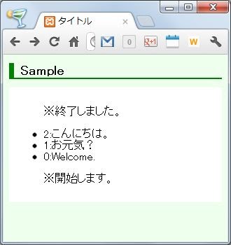 ここでは、EventSourceにonmessage/onstart/onendの3つのイベントをaddEventListenerで組み込んであります。onmessageでは、カウント数と受信メッセージを画面に追加表示します。onstartの場合、それまでの表示をクリアし、カウント数をゼロに戻します。onendイベントでは、Server Sent Eventsの通信を終了します。