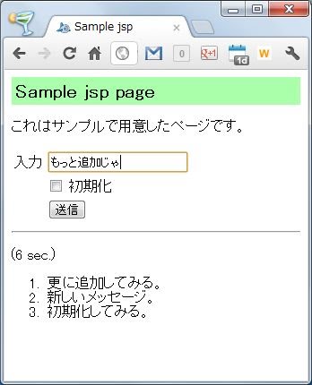 下にリストを掲載しておきます。アクセスすると、入力フィールドのある画面が現れます。ここでなにか書いて送信すると、それが下に表示されます。送信する度にそれはリストの一番上に追加されていきます。送信時に、「初期化」のチェックボックスをONにしておくと、セッションを初期化して新たにメッセージを追加します。