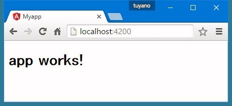 画面に「app works!」と表示されたら、アプリケーションが正常に実行されています。これが、サンプルで作成されているAngularアプリのWebページ画面なのです。