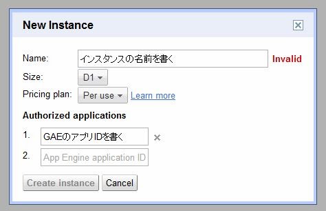 この右上に見える「New instance...」ボタンをクリックしてください。画面にインスタンス作成のためのダイアログが現れます。ここで、インスタンスの設定を記入していきます。