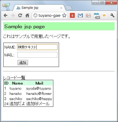 先ほどのJSPを更に追加して、レコードの追加と検索の機能も足してみました。NAMEとMAILという2つの項目があるフォームを用意してあります。そのままアクセスすれば、前レコードが表示され、フォームの2つの項目にテキストを書いて送信すると、そのデータがレコードとして追加登録されます。また、NAMEのほうにテキストを書いて送信(MAILは何も書かない)すると、そのテキストをNAMEに含むレコードを検索し表示します。