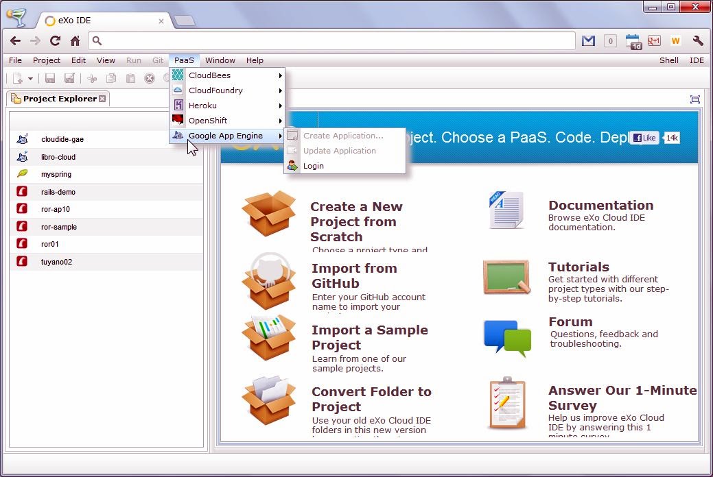基本的なものは、だいたいEclipseなどと似ていますので、使っているうちにだいたいわかるでしょう。重要なのは<PaaS>メニューです。これはcodenvy IDE独自のものといってよいでしょう。