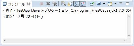 これらの記号を組み合わせてパターンのテキストを作ります。簡単な例を下にあげておきましょう。ここでは、"yyyy年 M月 d日(E)"というようにしてパターンを用意してあります。これで、「2012年 7月 22日(日)」というような形式で日時が表示されるようになります。年の値は、このようにyyyyと4つ並べると4桁表記に、yyとすると2桁表記になります。