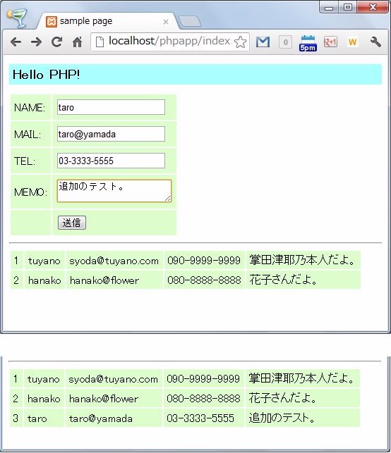では、先ほどのサンプルを修正し、レコードの追加を実装してみましょう。ここでは、index.php(前回作成したファイル)の他、新たに「add.php」というファイルを用意しています。index.phpにアクセスし、表示されたフォームに、名前・メールアドレス・電話番号・メモ書きを書いて送信すると、それらがレコードとして追加されます。