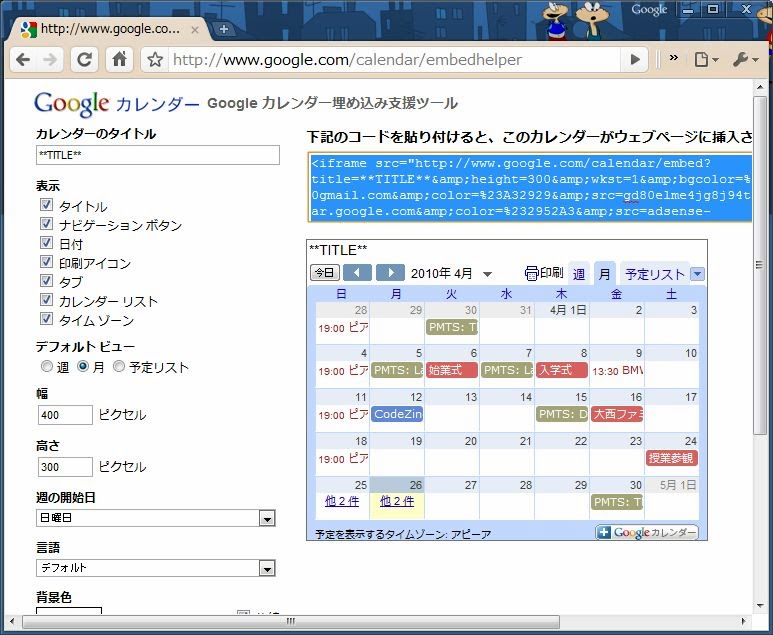 ここで、カレンダーの表示や大きさなどに関する諸設定を行うと、その状態でカレンダーを表示するための<iframe>タグが自動生成されます。このタグを、そのままWebページに貼りつけてやればいいのです。
