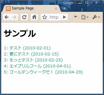 では、実際にカレンダーにアクセスしてイベントを取得し表示するサンプルをあげておきましょう。アクセスすると、指定のカレンダーの2010年度のイベントを最大10個取得し、そのイベント名(タイトル)と開始日時を順に表示します。
