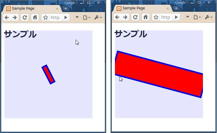 rotate( 角度 , 真偽値 )図形の回転は、2つの引数指定が用意されています。1つ目は、回転角度と、絶対位置からの角度かどうかを指定する真偽値を引数に渡すものです。例えば連続してrotateが呼び出されたとき、「最後の状態から回転させるか」「最初の状態から回転させるか」を指定するものです。trueにすると、常に「最初の状態から、第1引数の角度だけ回転させる」ということになります。falseなら、「そのときの状態から、更に第1引数の角度だけ回転させる」ということになります。