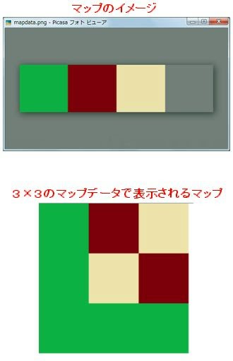下に掲載している、3×3のマップの表示例を見てください。サンプルで用意したマップデータが、上のようなマップデータでどのように表示されるのかがよくわかるでしょう。マップイメージとマップデータの関係がわかれば、マップデータをどのように用意すればいいかもわかってきますね?