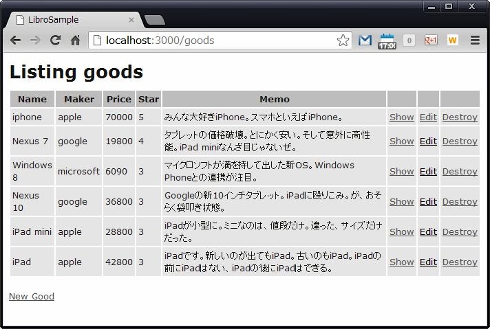 <%= good.maker.name %>このように、makerプロパティのnameを出力していることがわかります。先ほどのmaker.goodとまったく同様に、ここではgoodに「maker」というプロパティが用意され、そこに関連するMakerインスタンスが設定されているのです。