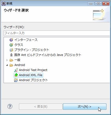 <ファイル><新規><その他>メニューを選び、現れたウインドウから、「Android」内の「Android XML File」を選びます。そして次へ進み、ファイル名に「list.xml」と設定して作成をしましょう。ソースコードは以下のリストのように修正します。