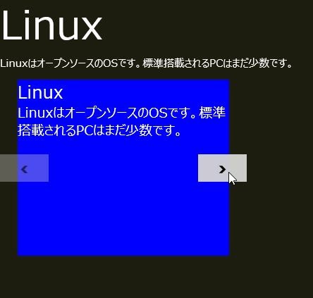 <div data-win-control="WinJS.Binding.Template">見ればわかるように、リストビューと全く同じですね。違いは、data-win-controlに「WinJS.UI.FlipView」を指定しているだけです。テンプレートの使い方も全く同じです。これで、用意したテンプレートを使い、フリップビューが表示されるようになります。起動時には最初のデータが表示され、自動生成される左右に移動するボタンをクリックして次々とデータを移動できます。