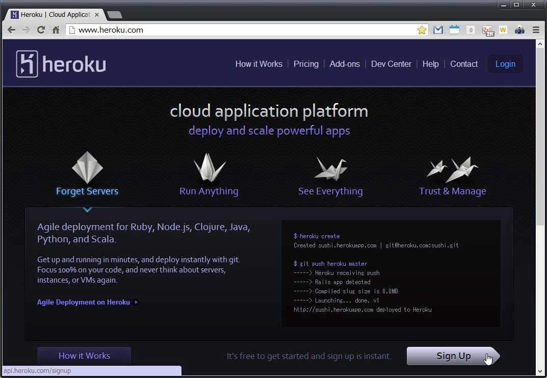 ●Herokuのアカウントを取得するまずは、Herokuのアカウント登録を行なっておかなければいけませんね。以下のアドレスにアクセスしてください。
