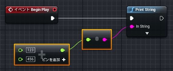 ブループリントでは、ある種類の値を別の種類を必要とする項目につなげると、自動的に値を適した種類に変換するキャストノードを追加してつないでくれます。なかなか便利ですね。