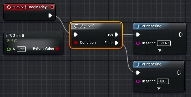 3. 「ブランチ」のTrue → 「Print String(EVEN!!)」の入力側Exec