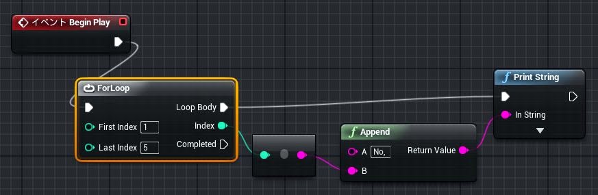 1. 「Begn Play」の出力側Exec → 「ForLoop」の入力側Exec